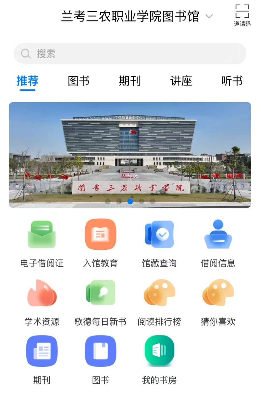 2.进入APP后,在首页选择所属单位为兰考三农职业学院图书馆;